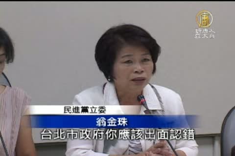 民進黨立法委員 翁金珠:「我在警察重重包圍下,被踩踏,左手也是一樣,被踩踏成三段,動員一萬名警察,說是非常好,但是現在高等法院法官已經判定了,認為你執法過當,台北市政府你應該出面認錯道歉」