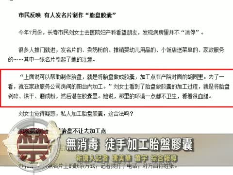 據大陸媒體《南方都市報》報導,今年7月份,長春市民劉女士去醫院婦產科看望朋友,在病房裡收到一張名片,名片上面寫著:“可以幫助製作胎盤,將胎盤做成膠囊,加工點在產院對面的胡同裡。”
