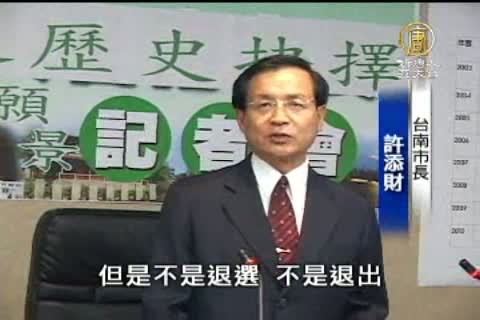 【新唐人亞太台2010年9月17日訊】黨內初選落敗的台南市長許添財,星期五,在參選登記截止的前2個小時,大動作召開記者會,宣佈自己將不會參選大台南市長。