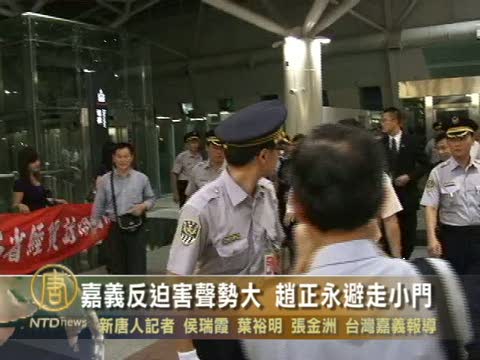 【新唐人2010年9月18日訊】16號晚間,陝西團搭乘高鐵抵達嘉義,現場200多位法輪功學員,要求立即停止迫害法輪功,最後隨團的陝西省代省長趙正永並沒有跟同行的中共官員從大門出來,疑似從高鐵站鐵道下方的特殊小門偷偷離開,而17號白天, 更是一路躲避媒體和群眾,甚至有傳言說趙正永已經在下午提前搭機離臺。