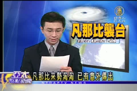 【新唐人亞太台2010年9月18日訊】凡那比來勢洶洶,目前已經有意外傳出,經濟部水利署晚間表示,石門水庫今天進行攔木索工程安檢時,一名謝姓工人不慎發生落水意外;北區水資源局將持續配合桃園縣消防局漏夜搜尋,除非天候不允許,絕不放棄搜救。另外台北縣平溪鄉1名7旬老婦今天遭人發現陳屍溪邊,瑞芳警分局說,相驗後發現老婦顱內出血嚴重,應墜落遭撞擊所致,排除他殺可能;研判老婦可能因颱風前夕搶割青菜,失足墜溪。