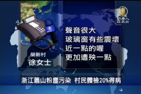 【新唐人亞太台2010年9月18日訊】中國浙江杭州一家採石場粉塵污染嚴重,危及當地村民的健康,在最近的一次體檢中,發現竟然有20%以上的村民患有膽結石、腎結石及塵肺病,調查結果也引發上千村民恐慌,當地居民表示,為了經濟開發,政府與污染企業利益掛勾,關廠機會,幾乎是完全沒有。