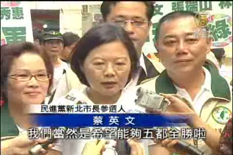 【新唐人亞太台2010年9月18日訊】民進黨新北市長參選人蔡英文,把握颱風前的好天氣,上午持續到中和的菜市場拜票,面對五都目前選情,蔡英文樂觀看待,認為民進黨有攻三坐四望五的可能。