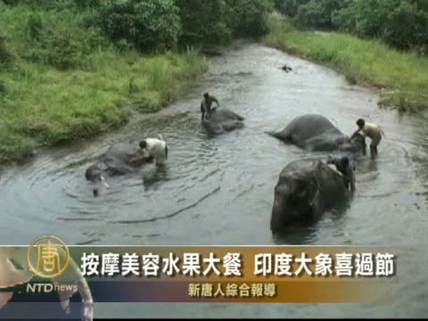 【新唐人2010年9月18日訊】星期五(9月17號),印度東部賈德帕拉(Jaldapara)野生動物保護區的森林官員,給大象安排了一個特別的假期。有按摩、有美容,還有水果大餐。
