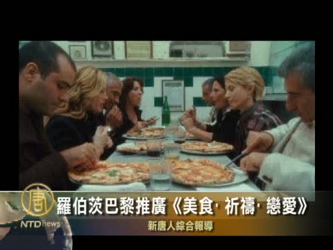 【新唐人2010年9月20日訊】星期天(9月19號),大明星茱莉亞•羅伯茨(Julia Roberts)在巴黎參加新片《美食•祈禱•戀愛》(Eat.Pray.Love)的首映式。