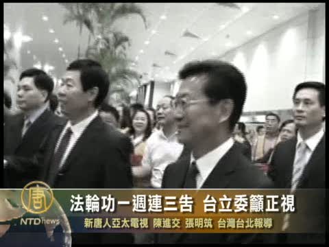 【新唐人2010年9月20日訊】從上週一到今天(20日),一個星期內,台灣法輪大法學會接連對來臺的三位中共官員提出刑事告訴,控告它們違犯「殘害人群罪」及民權公約﹔對此,台灣立委表示政府不應放行讓這些犯下人權罪行的中共高幹入境台灣﹔同時也呼籲高檢署應該正視法輪功的提告,並依法調查。