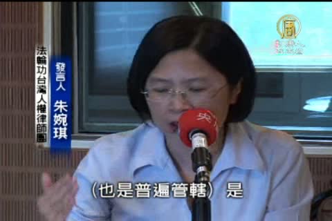 法輪功台灣人權律師團發言人 朱婉琪:「我們也想告訴我們的高檢署,在有法可依的情況之下,你要真正的依法辦理,那依法辦理有很多層次(這是檢察官有沒有尊重中華民國法律的測試)對!」
