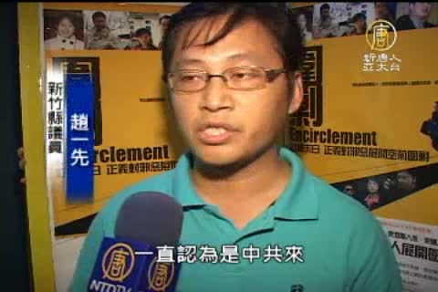 新竹縣議員 趙一先:「在還沒有來之前,我對《圍剿》這兩個字,一直認為是中共來要《圍剿》法輪功弟子,那我後來是發現是正義的力量要《圍剿》中共。所以我看完這部片 子之後,我發現自由,追求自由的種子是不會熄滅,我個人也對對岸,希望他們真正改革開放當中,不要再迫害法輪功的弟子,這個是不可抵擋的一個聲勢。」