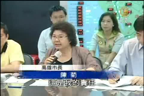 陳菊帶頭澄清高雄市的防洪系統,尤其是三民區 本和里滯洪池沒失靈,並強調該負的政治責任絕不推諉。