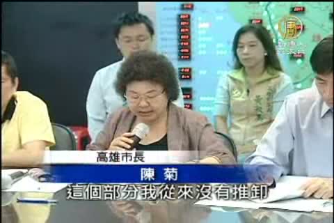 【新唐人亞太台2010年9月22日訊】919水災,災後已經第4天了,高雄市長陳菊上午到下水道維管中心,了解全市抽水機和電力恢復的情形,對於治水責任,陳菊昨天說中央要負責 80%的說法引發國民黨立委反彈,今天上午,陳菊表示,該負的政治責任絕不推諉,強調治水必須朝流域整治、提高防洪標準著手。