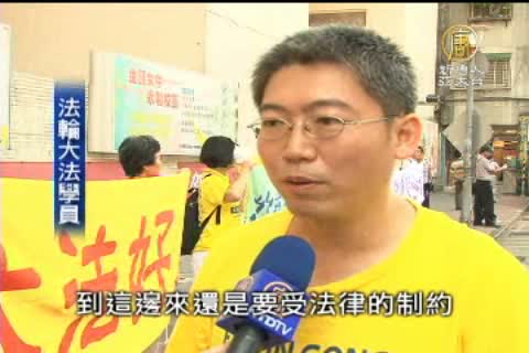 法輪大法學員:「這就是我們更要,站出來的原因,這個事情已經發生這麼久了,可是還是很多民眾不了解,這邊的接待的官員哪,接待方,他們也應該了解,他們 邀請的人,是什麼樣的人,他們不能因為,一個迫害人權的人,就是別的國家的事情,那其實,到這邊來,還是要受法律的制約。」