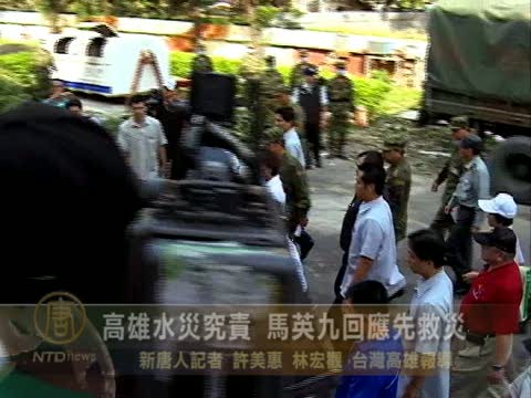 【新唐人2010年9月23日訊】中秋節這一天,總統馬英九忙碌不得閒,一大早視察高雄仁武災區,慰勉救災的國軍弟兄和南下支援的臺北市消防隊﹔至於對水患的究責問題,馬總統回應,現階段應該全力投入救災,至於責任歸屬,交由專家來判定。