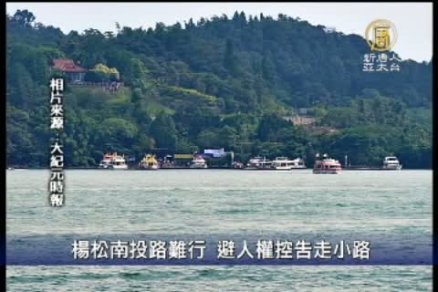 【新唐人亞太台2010年9月23日訊】為您插播一則最新消息。被台灣法輪功控告「殘害人群罪」的湖北省委副書記楊松今天人到了南投,當他到日月潭遊湖時,看到玄光寺下方的碼頭站滿了法輪功學員舉橫幅抗議,避走涵碧樓後門小路去搭船。後來在湖中繞了幾圈不敢上岸,最後上岸時,聽到岸邊的法輪功學員大喊『楊松,禁止迫害法輪功』,又迅速閃避快走回涵碧樓。