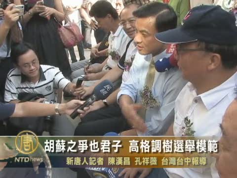 【新唐人2010年9月24日訊】同一選區的候選人,一定要針鋒相對嗎?台灣大臺中市市長侯選人胡志強和蘇嘉全兩位都表示,要拋開藍綠對立,為台灣進步和民主第一,打一場君子之爭,為選戰留下好風範。請看我們的記者來自台灣臺中的報導。