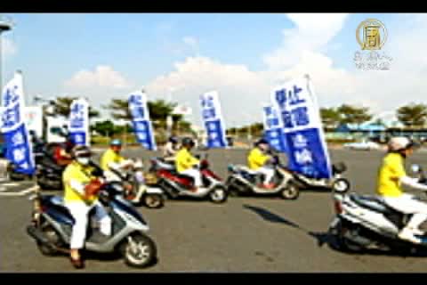 【新唐人亞太台2010年9月24日訊】湖北省委副書記楊松,上午原訂要參觀台南一家知名企業,但又臨時取消,前往高雄夢時代購物廣場,從圖片中可以看到,高雄夢時代前的時代大道,當時是下午一點半,法輪功學員拉開約20米長,寫著「停止迫害、江澤民等被起訴」的橫幅。人在高雄的楊松,也並沒有按照預定參訪行程,只在夢時代停留約半小時,當楊松的座車離開時,法輪功學員舉著「楊松人權惡棍 台灣不歡迎你」的看板。至於楊松被刑告殘害人群罪,上午也有新的進展,高檢署已經分案辦理。