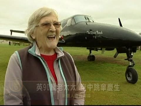 【新唐人2010年9月25日訊】從飛機上一躍而下跳傘,不是一般人敢作的事。但90歲的喬.哈丁婆婆是個例外。9月23日,她和悉心指導她的跳傘隊在空中慶祝了90歲生日。