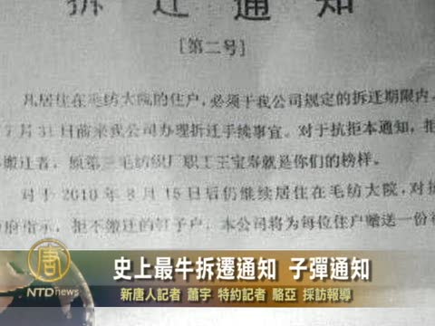 【新唐人2010年9月27日訊】內蒙古呼和浩特市賽罕區一些居民,最近接到房地產公司所寄的所謂“拆遷通知”,內容充滿威脅字眼,並附上一顆實體子彈,讓收到信的人都驚恐萬分。