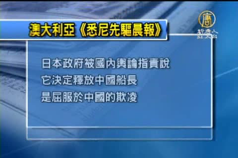 澳大利亞《悉尼先驅晨報》 9月26日刊登法新社的報導說,日本政府被國內輿論指責說,決定釋放中國船長是屈服於中共的欺凌,日本首相菅直人周六在紐約出席聯合國大會間隙對記者們說:日本檢察院釋放中國船長的決定是在未受政治因素幹擾的情況下作出的。