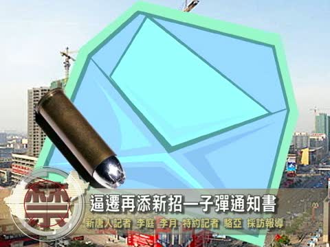 【新唐人2010年9月28日訊】中國大陸,發生在中共體制下的逼遷之戰,被演繹得慘烈異常。為逼遷,中共各層官員可以說是出盡各種毒招。最新的一起內蒙古呼和浩特市的「子彈拆遷通知書」,又在網絡上引發熱議。網民說這是「最牛拆遷通知」,中共逼遷已經到了有恃無恐的地步。