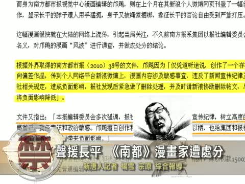 【新唐人2010年9月28日訊】《南方週末》新聞部主任、《南都週刊》副總編輯長平因為做熱點時事評論,觸及到中共敏感議題,今年8月份,他的兩個專欄被叫停。而《南都》漫畫家鄺飚為聲援長平創作一幅漫畫走紅媒體網絡,最近,他因此收到報社的罰款和降級處分。