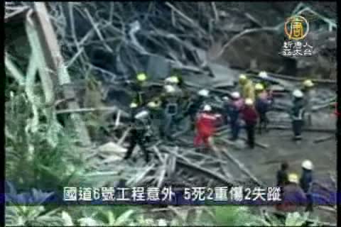 【新唐人亞太台2010年9月30日訊】正在施工中的國道六號「北山」交流道興建工程,今天(30號) 中午一點多發生鷹架塌陷意外,造成路面一百多公尺塌陷,九名工人掉落河床,被鷹架壓住,目前已知五人死亡、兩人重傷,還有二人失蹤。深度大約有五六層樓高,因此救援工作相當困難,意外發生後,軍方工兵部隊也已經出動協助救援。至於意外發生原因,還有待進一步調查。