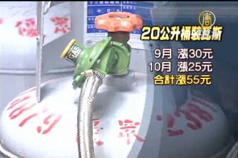 【新唐人亞太台2010年10月1日訊】瓦斯的價格又要調漲了。繼9月每桶20公斤裝瓦斯漲30元之後,10月預計再漲25元,2個月瓦斯價格就漲了55元,小吃攤一個月要多3300元的瓦斯錢,就連瓦斯行的老闆都開始擔心,明天出去送貨,客人又要罵聲不斷。