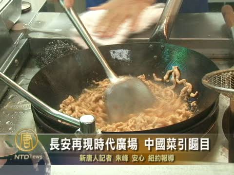 四面被五光十色的電子屏幕環繞的紐約時代廣場突然出現仿唐建筑的廚車、敦煌圖案的涼傘,甚至連盛菜的小轎也是仿古設計,連服務生都身著特別設計的古式服裝,無論是西方人還是華人都感到這是難得的中國文化盛宴,今天的貴賓席一時間一票難求。