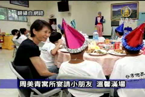 總統夫人周美青中午在寓所宴請世界展望會五十位小朋友,周美青一席牛仔褲、黑T恤,頂著大太陽、拉著馬小九在門口親自迎接小朋友們,陪他們用餐,甚至還親手做三明治,菜色包括炸雞腿、薯條等,馬總統最後也趕到會場,場面溫馨。