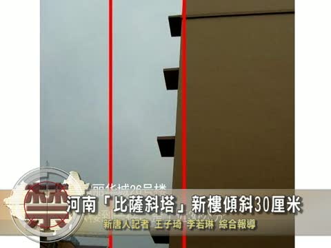 【新唐人2010年10月4日訊】最近,大陸再次出現問題樓盤!河南剛交房的富麗華城被業主發現,大樓牆體嚴重傾斜,六樓屋頂至地面歪了近三十厘米。而政府各行政職能部門僅花一天驗收合格,網民痛斥官員和黑心地產商勾結。