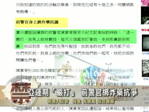 【新唐人2010年10月4日訊】中共當局趁廣州亞運的籌備,開始新一輪的全國大範圍的嚴打,異議人士、維權人士、法輪功人士,都被列入了黑名單。一名被列在黑名單上的前警官爲了抗議嚴打,將炸藥綁在身上,要和公安玉石俱焚。