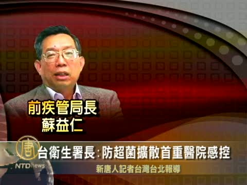 【新唐人2010年10月5日訊】針對前疾管局長蘇益仁表示,超級細菌的台灣首位感染者應該隔離,否則將增加社區傳染的風險。衛生署長楊志良5號回應,超級細菌透過血液,或是傷口才會感染,目前最重要是提升醫院的感染控制能力。