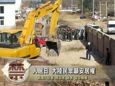 【新唐人2010年10月6日訊】10月4號是聯合國確定的“世界人居日”,但是,“居者有其屋”,這項基本人權對於不少中國人來說,還是一個奢望。“人居日”當天,中國各地的一些拆遷受害者和其他無法安居者,採取大散步、大展示等活動形式,抗議中共體制下的高房價、高物價、野蠻拆遷等問題,呼籲“還我安居權”。