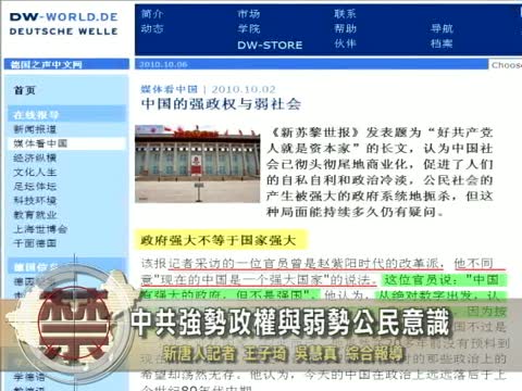 【新唐人2010年10月7日訊】最近,瑞士《新蘇黎世報》發表題爲“好共産黨人就是資本家”的評論文章,認爲中國社會已徹頭徹尾的商業化,公民意識被強勢的中共政府有系統的扼殺。《德國之聲》引述這篇評論文章說,號稱強大的中共政府,只是政府強力控制,國力幷不強大,尤其百姓的公民意識還很薄弱。
