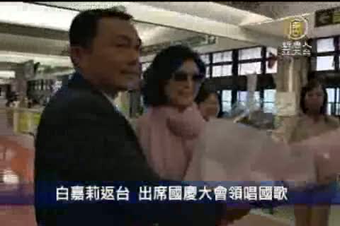 【新唐人亞太台2010年10月7日訊】今年國慶大會上,將與歌手王芷蕾、男高音王典共同領唱國歌的資深藝人白嘉莉,今天(7日)下午搭機抵台。長年旅居印尼的白嘉莉,往年都會抽空返台參加雙十國慶,今年她首度應邀在國慶大會上領唱國歌,她說非常感謝大家記得她,她也覺得很榮幸也重視這次的國慶大會演出。抵台前,白嘉莉還特別前往香港置裝,要在國慶大會上讓大家眼睛一亮。