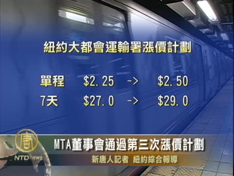【新唐人2010年10月8日訊】10月7日,紐約市大都會運輸署(MTA)董事會以12票贊同2票反對,通過了地鐵票漲價計劃。為了填補8億美元的財政赤字,MTA在三年內已連續三次上調公共交通的票價。請看報導。