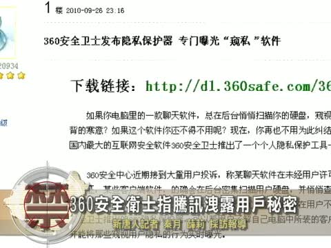 【新唐人2010年10月8日訊】中國大陸的安全軟件商360在他們的論壇中發佈最新公告表示,他們最新推出的「隱私保護器」顯示Q Q軟件會掃瞄用戶隱私文件和數據。騰迅否認了這個指責,解釋說掃瞄行爲是防止木馬的安全措施。業內人士表示,騰迅與中共政府有關部門合作,監控用戶早已是公開的秘密。