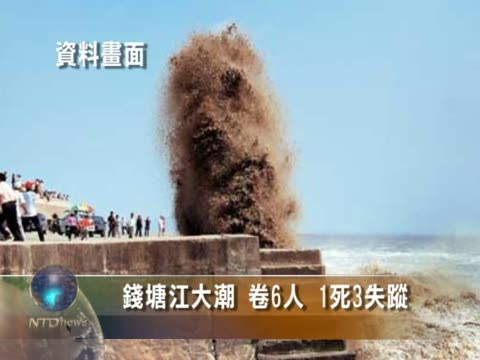 【新唐人2010年10月11日訊】據浙江杭州媒體報導,10月10號下午2點,錢塘江大潮捲走了6名觀潮人,之後救出來2人,打撈到1具屍體,還有3個人失蹤。