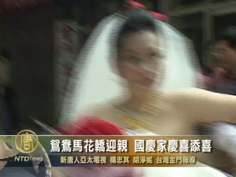 【新唐人2010年10月11日訊】2010年10月10號10點10分,全世界很多地區的華人舉行集體婚禮,一來慶祝中華民國雙十國慶,一來期望自己的婚姻十全十美。在這些集體婚禮中,台灣金門的很有特色,現場除了西式的禮車之外,更有金門傳統的鴛鴦馬和中式婚禮的花轎。