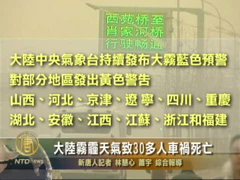 【新唐人2010年10月11日訊】連日來,大陸因十二省市區遭遇霧、霾氣候,最低能見度只有100米,這給各地航運、公路、鐵路交通造成一定影響。同時因為低能見度導致多起重大車禍事故,造成30多人死亡。