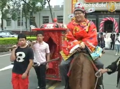 【新唐人2010年10月11日訊】2010年10月10號10點10分,全世界很多地區的華人舉行集體婚禮,一來慶祝中華民國雙十國慶,一來期望自己的婚姻十全十美。在這些集體婚禮中,台灣金門的很有特色,現場除了西式的禮車之外,更有金門傳統的鴛鴦馬和中式婚禮的花轎。