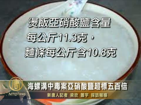 【新唐人2010年10月13日訊】四川省疾病預防控制中心,近日公布海螺溝遊客集體中毒事件檢驗報告,在明珠花園酒店採樣檢測的樣品中,有12種檢出亞硝酸鹽成分,其中麵條、燙飯、泡菜含量還高達每公斤8.41到11.3克。目前該酒店已暫時歇業。