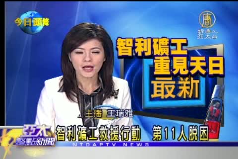 【新唐人亞太台2010年10月13日訊】新聞一開始,馬上帶您來看智利礦工救援行動的最新消息。目前第1梯次已經全數救援完畢,目前正在進行第2梯次的救援計畫,而第11名礦工,已經在台北時間晚間八點三十五分,被成功救出。