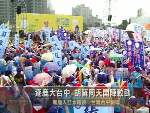 【新唐人2010年10月14日訊】13號上午,台灣國民兩黨大臺中市長候選人,同時成立競選總部,藍營總動員,國民黨黨主席馬英九,以及黨內重要大老,紛紛站臺輔選,表現中央上下一條心﹔而民進黨則是派出,前行政院長謝長廷、前臺中市長張溫鷹,與蘇嘉全的岳母等市議員,以溫馨關懷弱勢作為訴求,要來贏得選民的支持。