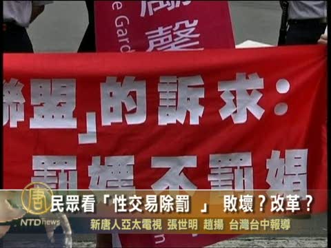 【新唐人2010年10月15日訊】性交易該不該「除罰化 」?一直是台灣政府和學者長期討論的課題,明年11月之後,法令將朝「不罰娼不罰嫖」的方向修法,民眾觀感如何?繼續是我們的報導。