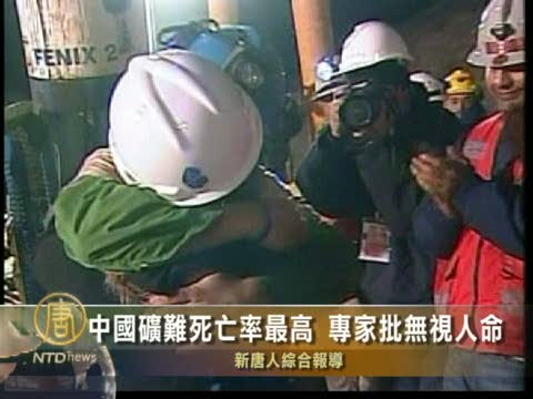 【新唐人2010年10月15日訊】智利33名礦工受困地底礦坑,經過69天之後,全部活著返回地面,靠的不只是運氣,這起事件,讓許多人首先聯想到了中國的550萬礦工的處境。中國礦工目前是世界上致死率最高的職業,專家表示,這是由於當局封鎖礦災消息、官商勾結、腐敗、領導階層沒有把人民的生命看作第一重要。
