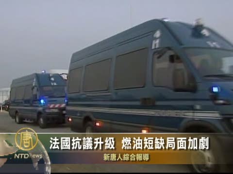 【新唐人2010年10月16日訊】法國總統薩爾科齊星期五(10月15日)派防暴警察前往受罷工影響而停業的油庫,幫助油庫恢復運營。法國不斷升級的抗議延長退休年齡的大罷工已令燃油短缺的局面加劇。