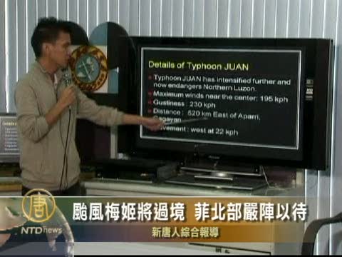 【新唐人2010年10月17日訊】菲律賓今年以來最強颱風—梅姬預計將在星期一登陸北部地區,當地政府,居民和軍隊都嚴陣以待,準備將損失降到最低。