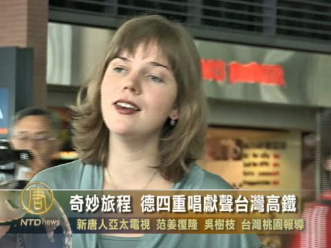 【新唐人2010年10月18日訊】台灣高鐵桃園站為了讓旅客體驗不一樣的高鐵行程,特別邀請德國的女聲四重唱Niniwe樂團獻唱,和諧迷人的女聲重唱,吸引相當多的高鐵旅客駐足欣賞。