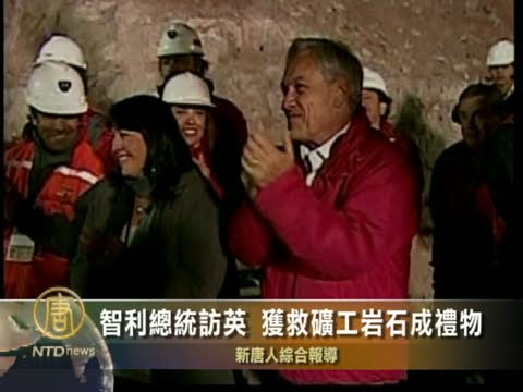 【新唐人2010年10月19日訊】正在英國訪問的智利總統皮涅拉給英國女王和首相帶來了特別的禮物,那就是獲救礦工從井下帶上來的岩石。