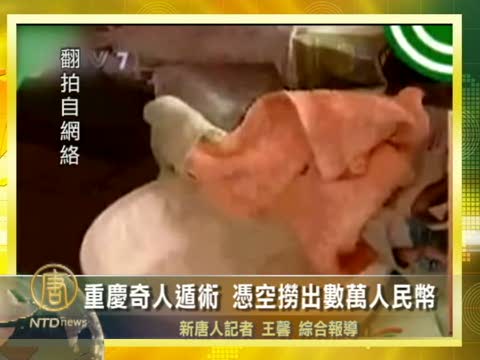 【新唐人2010年10月20日訊】中國重慶一名奇人,最近在攝影機前面表演憑空撈錢的絕活,他在半盆清水上覆蓋2條毛巾及2張報紙,就這樣50分鐘內撈出近3萬元人民幣,讓觀眾看得目瞪口呆。